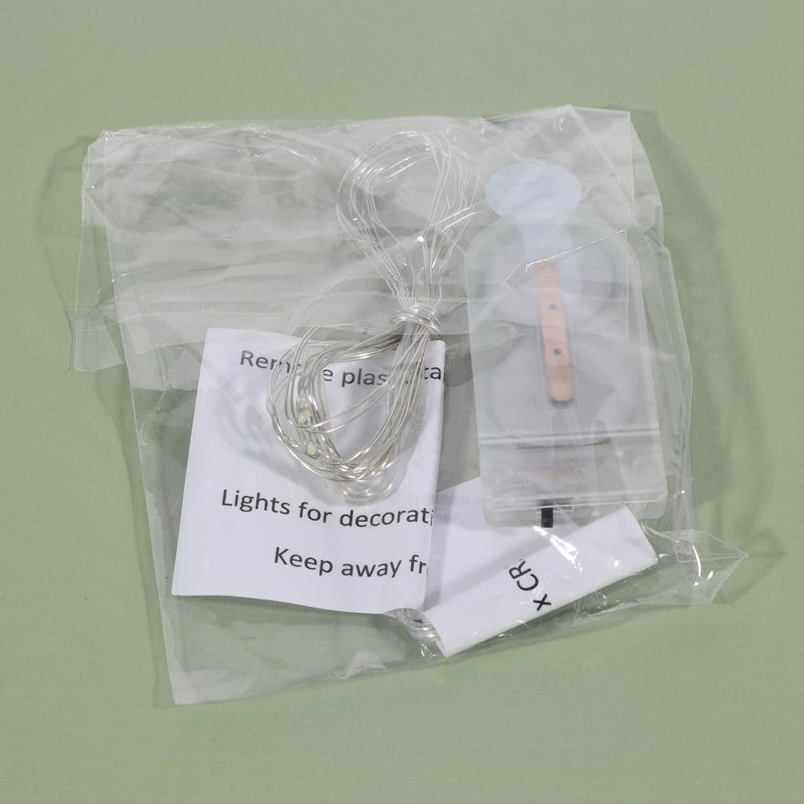 This item is a 10-bulb Christmas string light supplied with batteries and measures 1 m in length. The product consists of a 1 m cable with ten bulbs spaced along the wire for decorative lighting. It is designed for interior décor applications and battery power allows flexible placement.